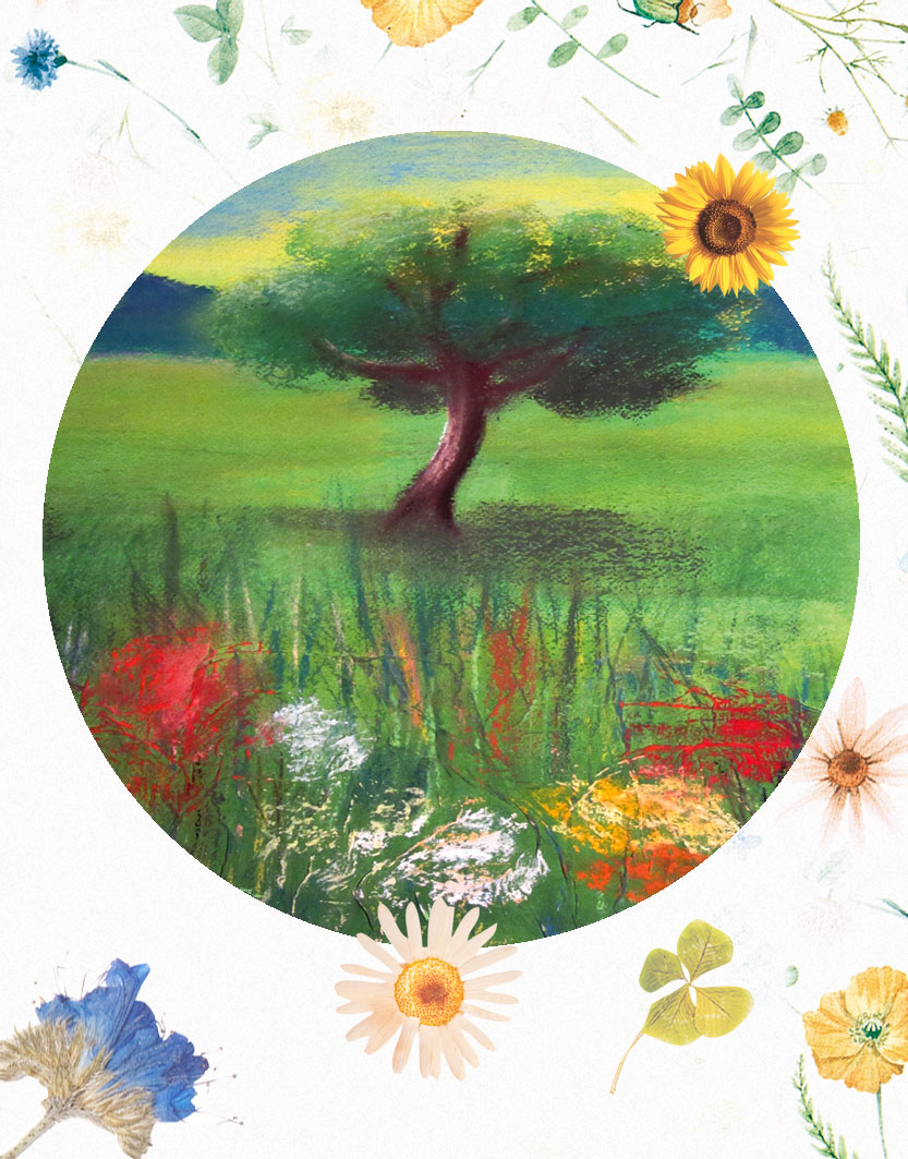 Farbige Landschaft mit einem Baum und bunten Blumen in einem ovalen Rahmen.