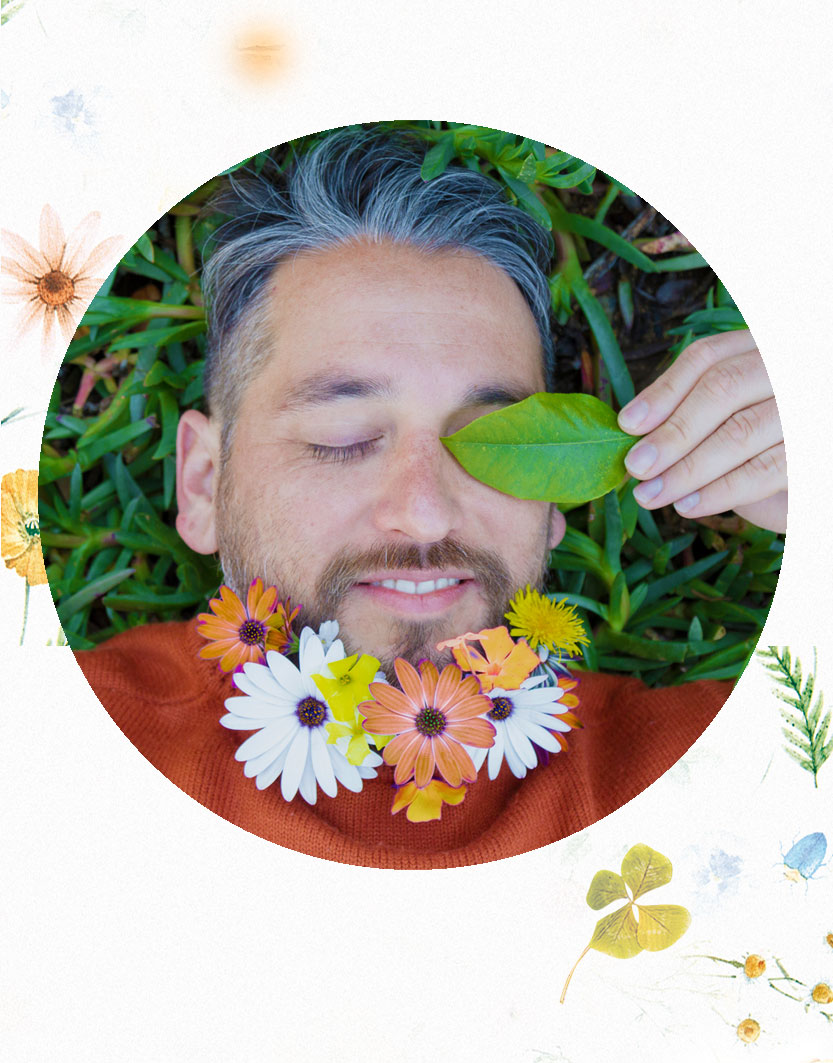 Ein Mann mit Blumen und Blättern um das Gesicht, entspannt auf grünem Gras.