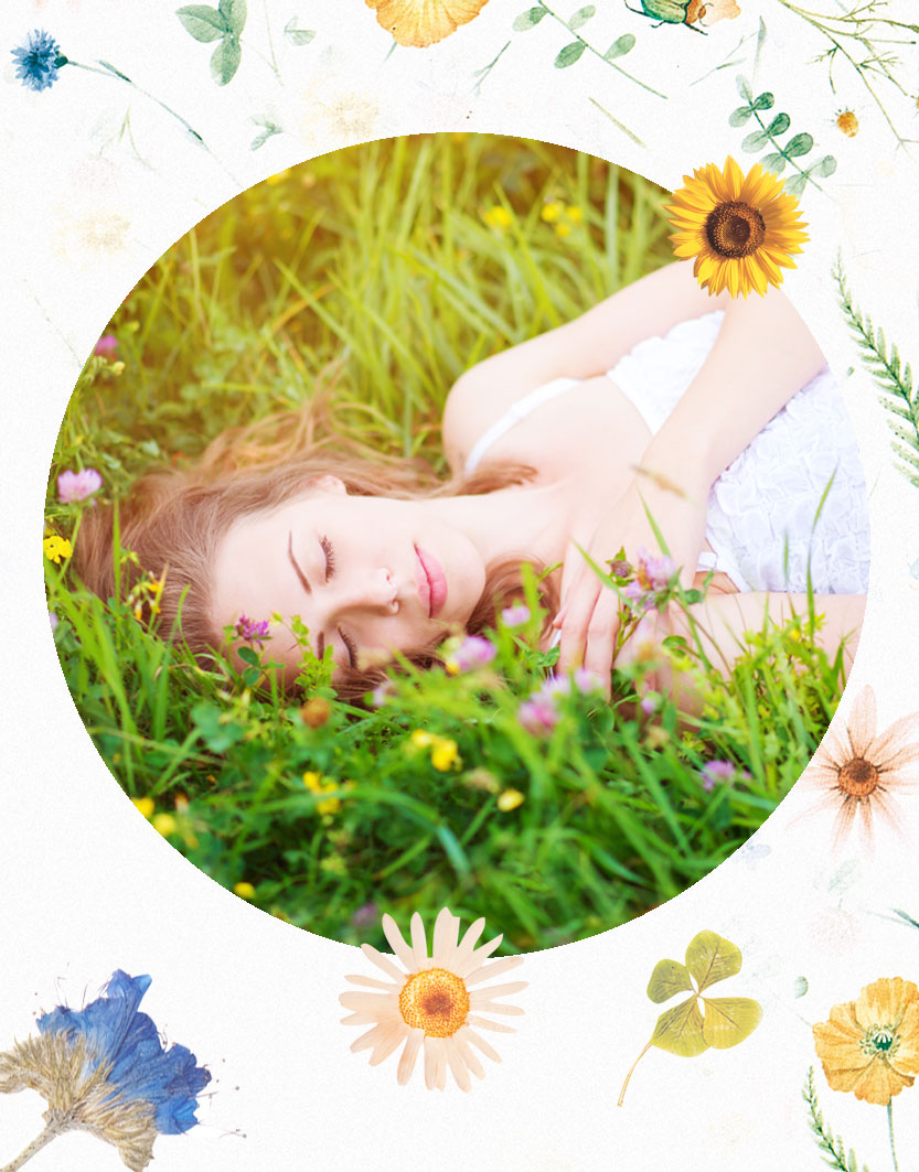 Frau liegt entspannt auf einer blühenden Wiese, umgeben von Blumen und Sonnenlicht.
